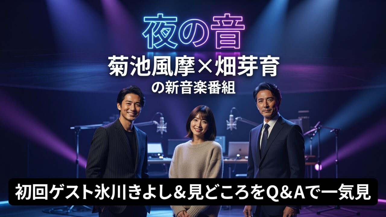 夜の音 -TOKYO MIDNIGHT MUSIC-』は、2026年4月7日にスタートした、日本テレビ系の新音楽番組。MCは菊池風磨×畑芽育で、初回から氷川きよしのライブ(「限界突破×サバイバー」)が入るなど、番組の“色”がはっきり見える立ち上がりでした。 (natalie.mu)